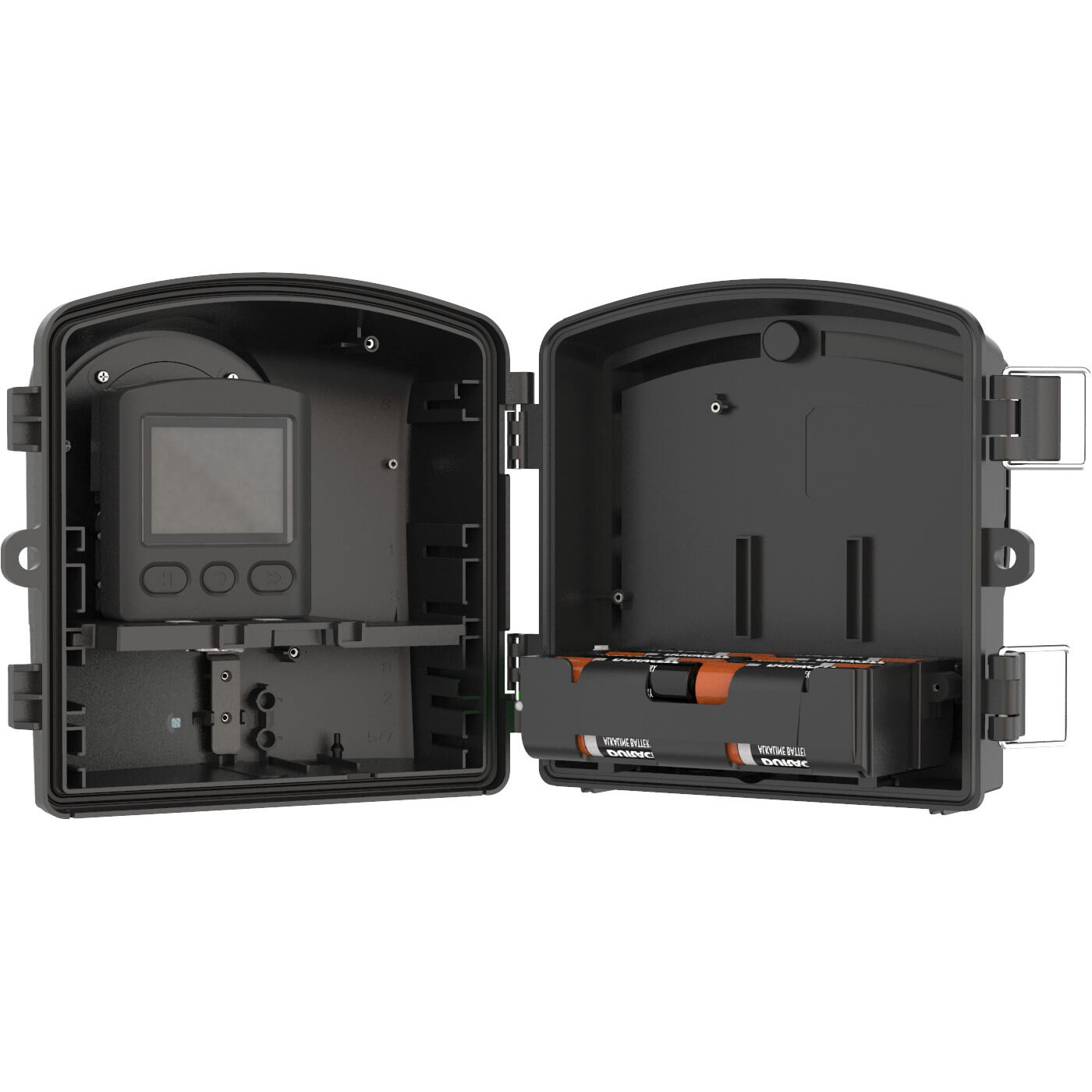 Secretul carcasei ATH2000 este magazia interna de baterii. Poti introduce 16 baterii AA (alcaline sau litiu) care se conecteaza la camera prin portul Micro-USB sau USB-C (adaptoare incluse). Camera va consuma intai energia din carcasa, apoi va trece pe bateriile ei interne, asigurand o plasa de siguranta dubla.