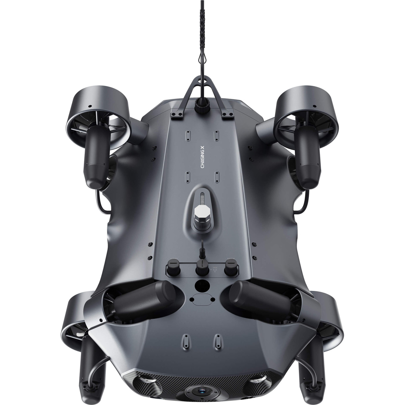 La 350 m adancime intunericul este absolut. Pentru a taia prin obscuritate si apa tulbure, Chasing X a fost dotat cu doua faruri LED cu ajustare fluida (stepless dimming), care elibereaza un total de 12000 Lumeni. Modulul optic utilizeaza un senzor CMOS generos de 1/1.8" capabil de rezolutie 4K UHD (30 FPS) si fotografii de 8 MP. Inovatia consta in sistemul Electronic Pan-Tilt integrat pe o lentila emisferica low-light, permitand operatorului sa ajusteze unghiul camerei electronic pentru filmari panoramice line, fara a roti intreaga drona.