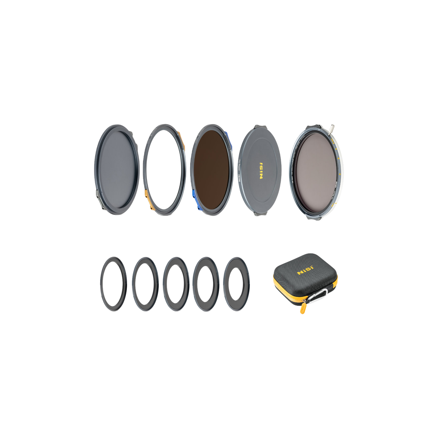 Kitul conține și accesorii esențiale: 3 inele adaptoare magnetice (82mm, 86mm, 95mm), capace magnetice față-spate și o husă caddy compactă, pentru transport sigur și organizat.