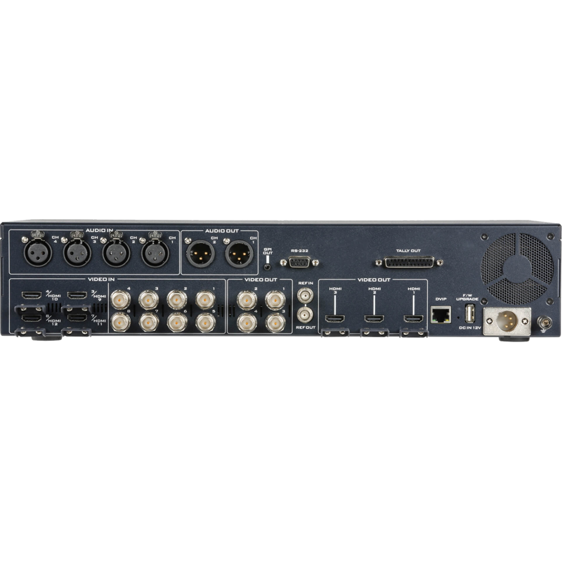 videoswitcher 4K Datavideo SE-4000 este un switcher UHD cu 12 intrari, gandit pentru productii live unde ai nevoie de multe surse si flexibilitate mare. Configuratia include 8 intrari 12G-SDI si 4 intrari HDMI, iar din cele 12 poti selecta 8 canale live pentru lucru in productie (select 8 din 12). La iesiri ai in total 7 output-uri: 4x 12G-SDI si 3x HDMI, utile pentru program, multiview, feed-uri secundare sau inregistrare.