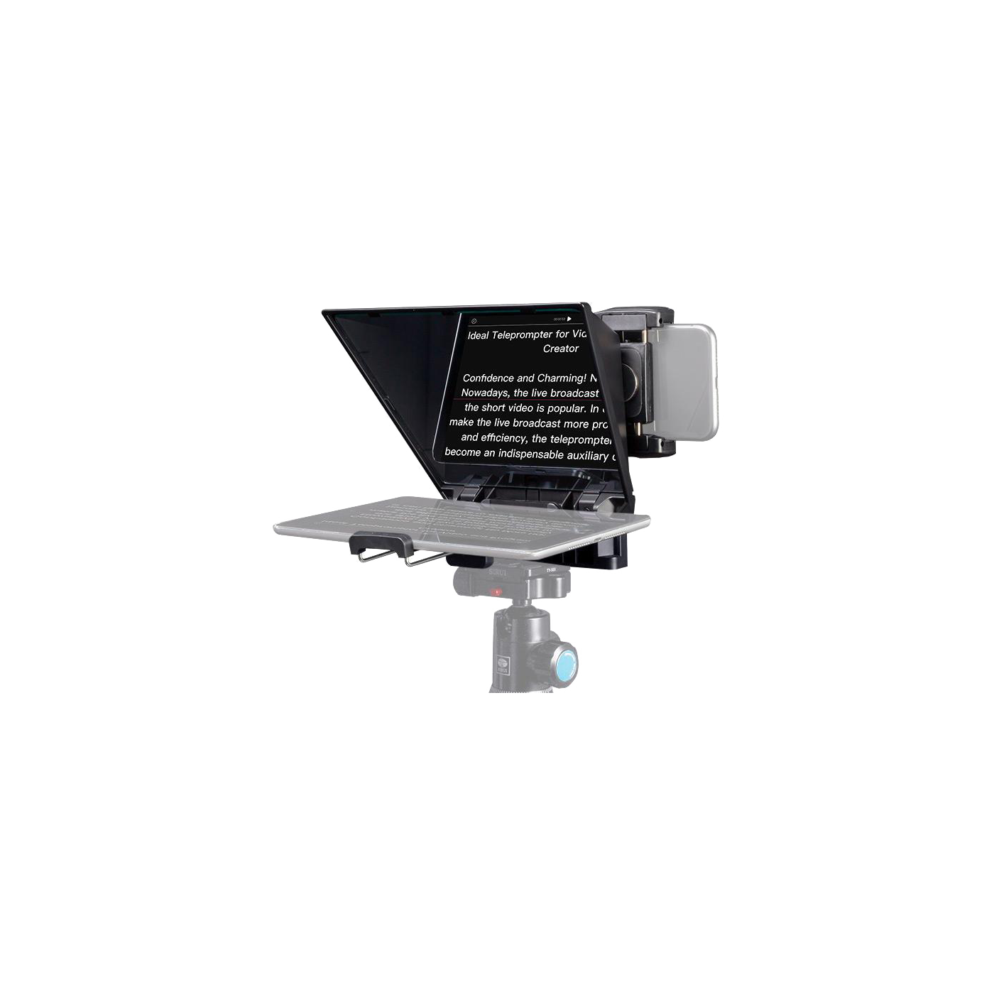 Sticlă de Teleprompter: Utilizează sticlă de teleprompter cu separator de fascicule 70/30 pentru o vizibilitate clară a textului și pentru a permite filmarea directă.