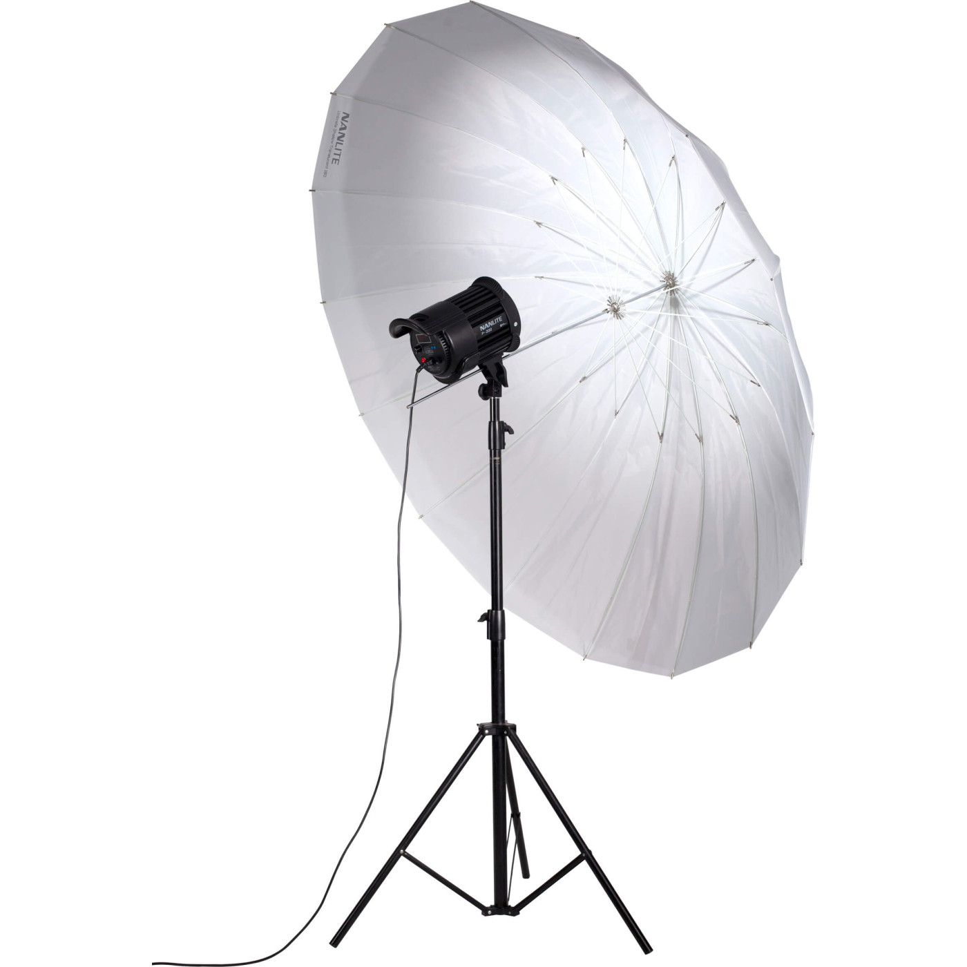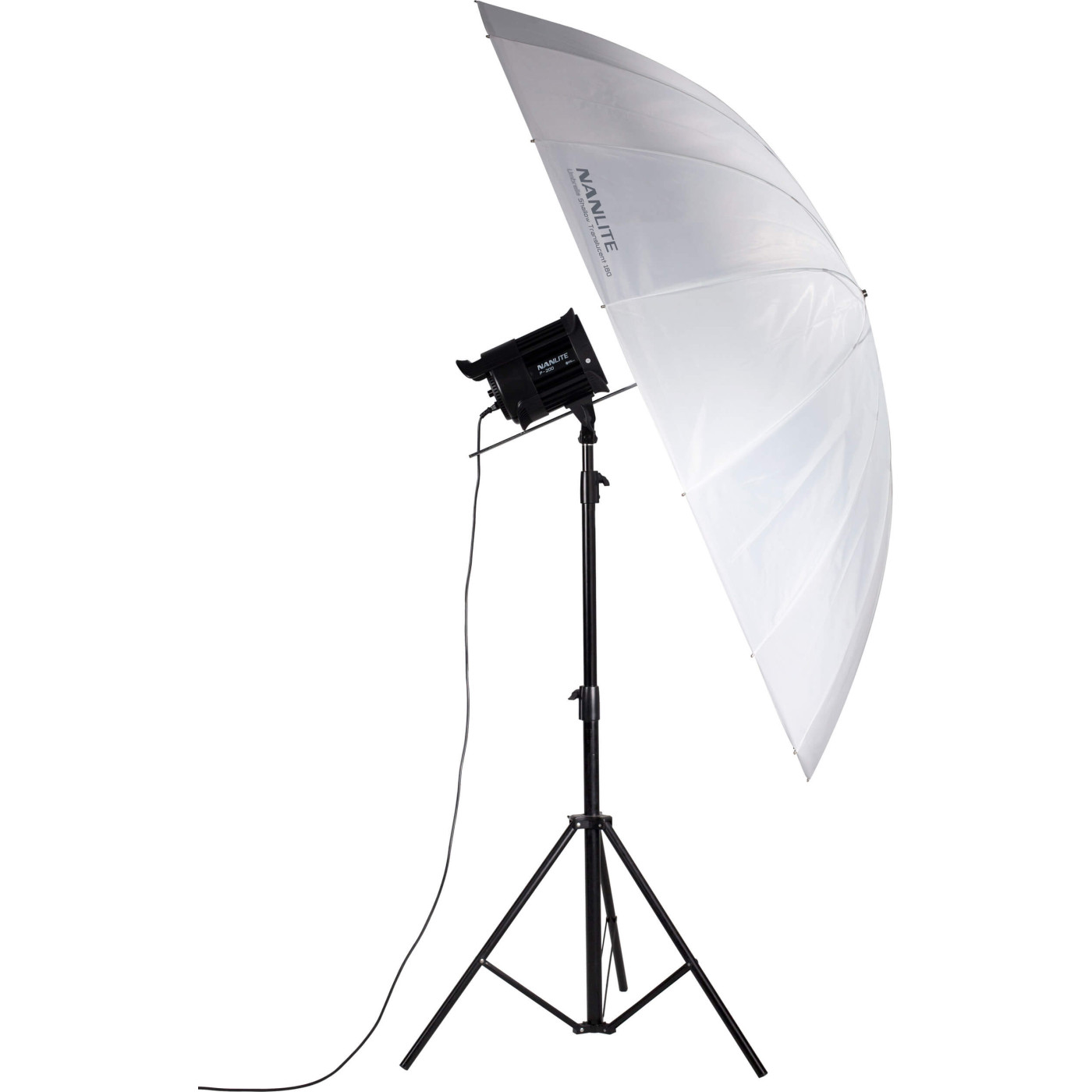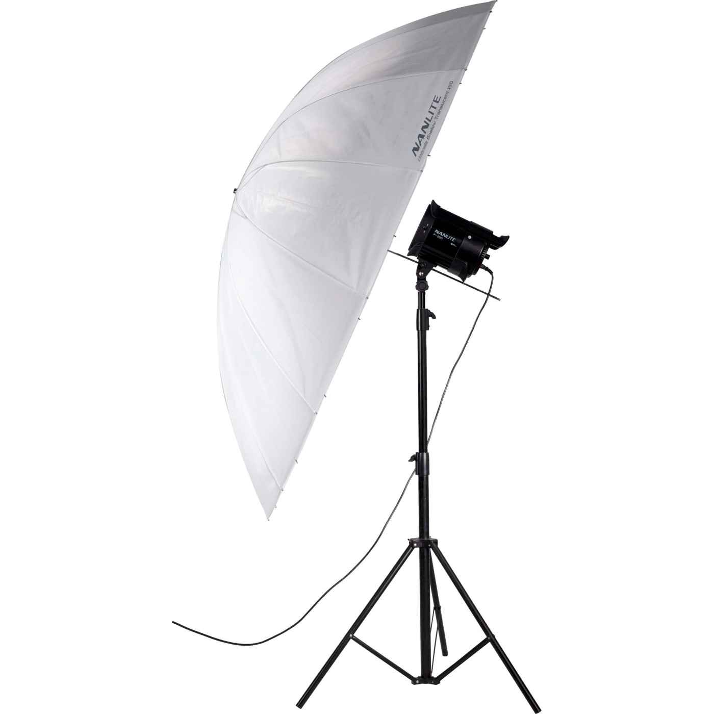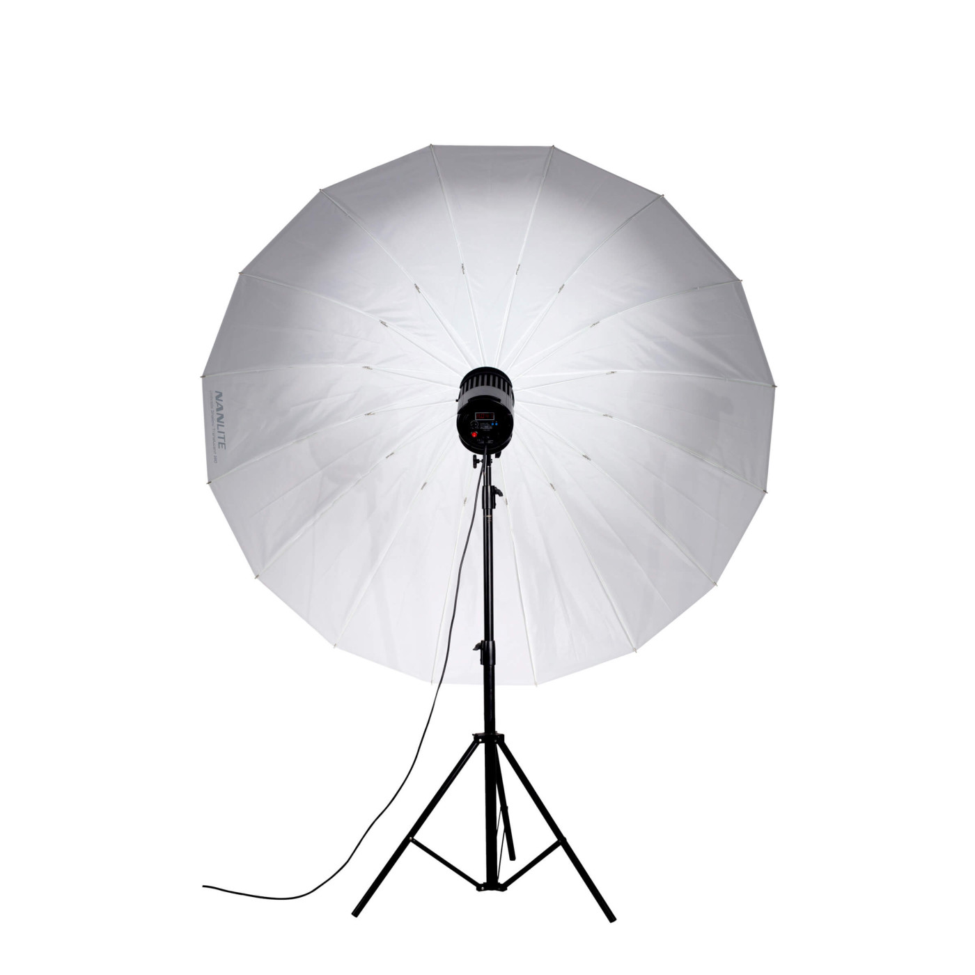 Sasiul umbrelei permite un control precis asupra calitatii luminii prin simpla glisare a unitatii flash sau LED pe axul de 8 mm. Pozitionand sursa mai aproape de centrul umbrelei, obtineti o lumina mai focalizata si un fascicul mai ingust. Prin indepartarea sursei, lumina "umple" intreaga suprafata de 180 cm, rezultand o acoperire de tip "flood", necesara pentru a lumina fundaluri mari sau grupuri numeroase de persoane.